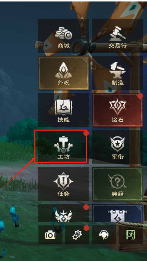 进入方式:通过地图下方找到菜单栏目,进入工坊,便进入到了我们的镶嵌、赋能、淬炼系统界面当中。