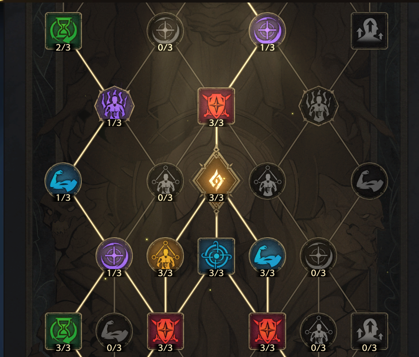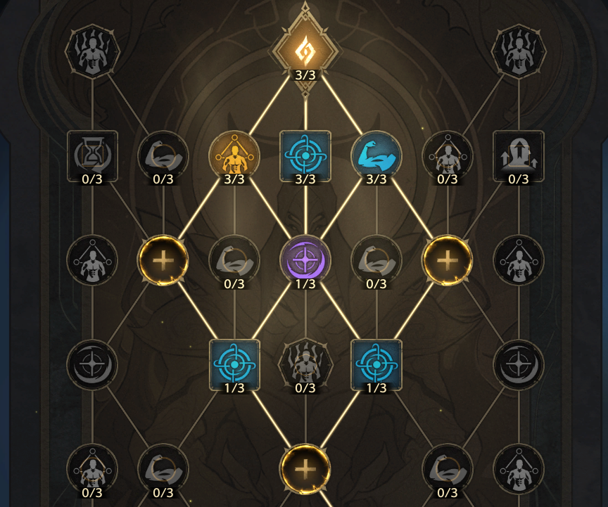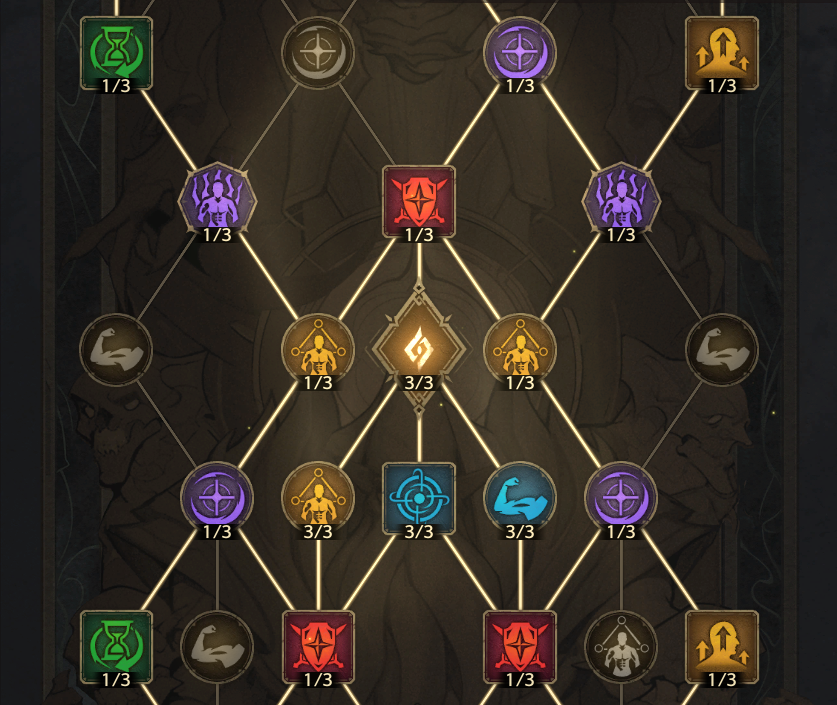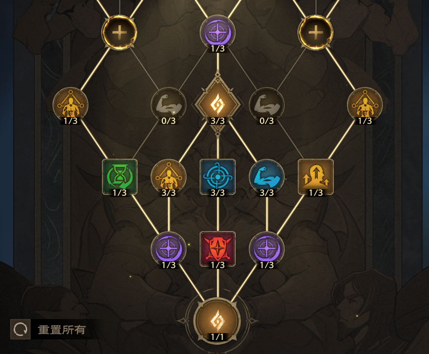 1、核心1/3:前置小节点全部点满,提高命运回响BUFF质量的同时, 额外获得铭石能量,快速获取铭石技能。