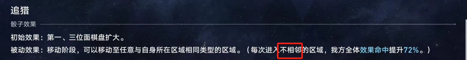 追猎:不限邻的区域增加72%的命中效果,能够通过骰子的被动来叠加命中效果。
