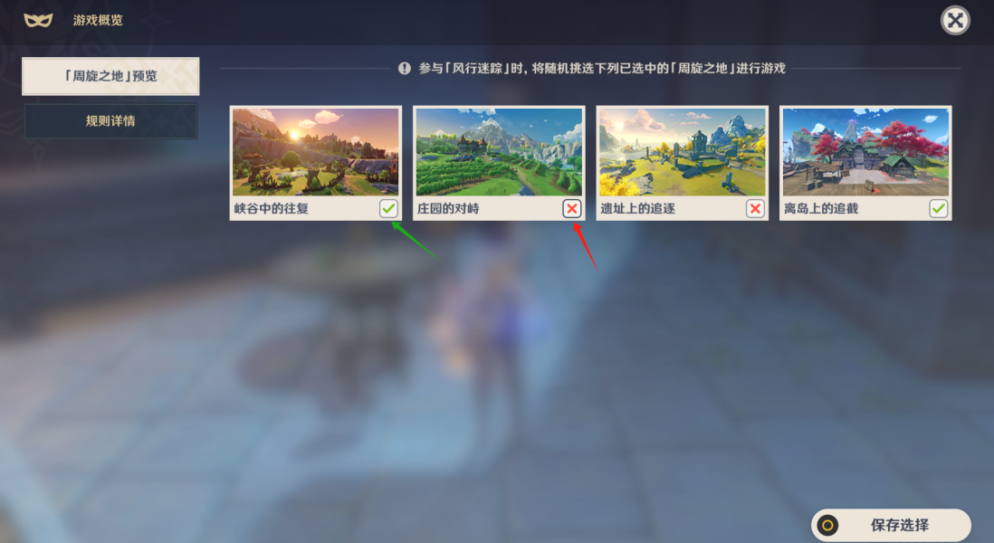 一共4张地图,默认勾选,随机进入。如果想玩特定的地图,就把其它的3张地图全X掉,或者不想玩的地图也X掉即可。