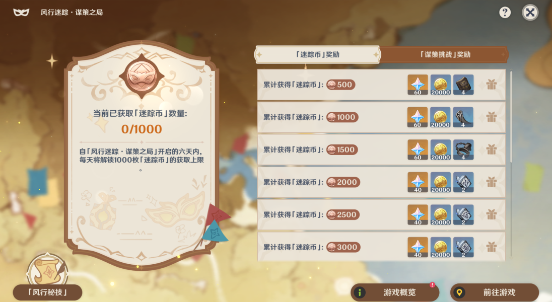 3、玩法介绍:每天解锁1000「迷踪币」,前面没玩会累积,6天全部解锁。