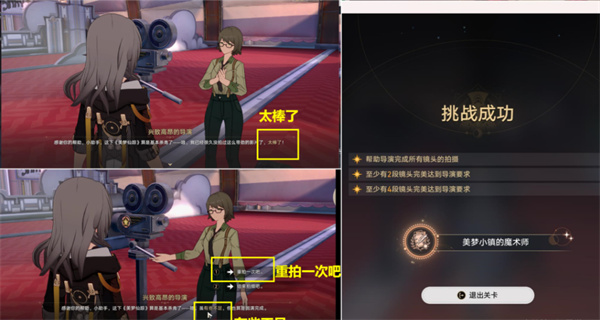 8、在前五次拍摄都完成后,导演就会出现“太棒了”选项,完成副本后,即可获得隐藏成就“美梦小镇的魔术师”,如果导演最后说的是“有些不足”,那就选择“重拍一次吧”。