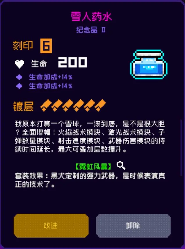将霓虹风暴子弹替换为电属性的近距离的持续激光以及长蓄力子弹,并获得25%的激光战术模块增伤,持续30秒。