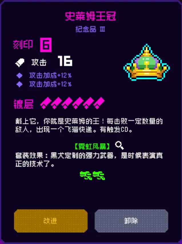 不仅能够提高各个战术模块的持续时间,且还能提高战术模块最大可叠加层数,而「史莱姆王冠」将会提高飞猫快递出现次数,进一步提高拾取战术模块的效率。