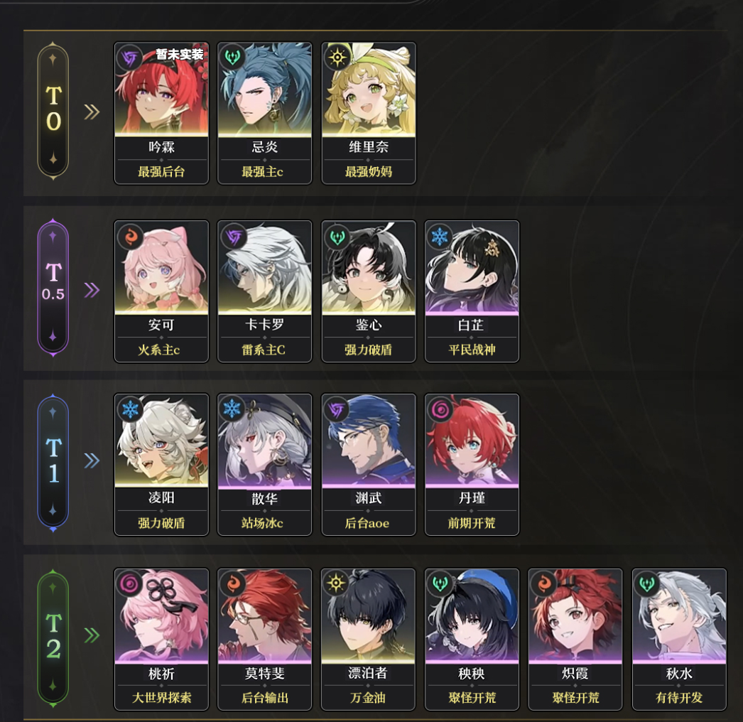 T0.5:仅次于T0梯队,只是比T0梯队的角色的某些属性差一点,但不多。
