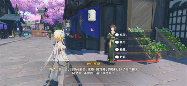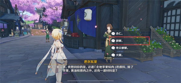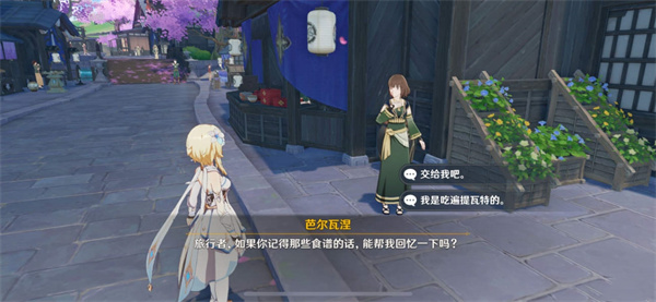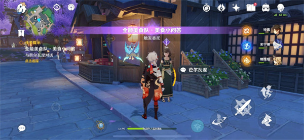 1、玩家首先需要来到稻妻城内,与芭尔瓦涅对话来获取任务“全能美食队·美食小问答”。