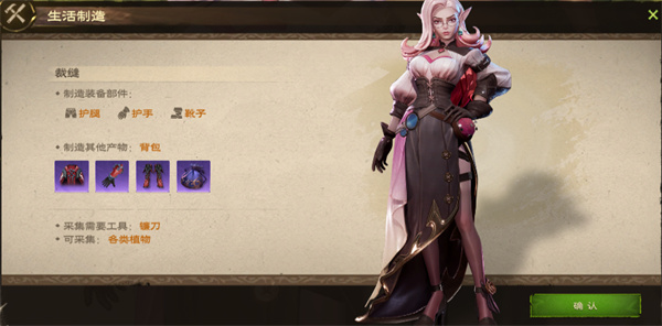 功能:选择裁缝生活技能,将可以制造护腿、护手、靴子部位的装备部件,并可以制造背包容器,用于增加角色可携带的物品量与仓库容量。