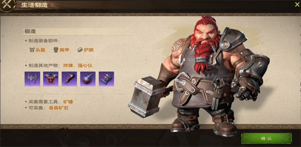 功能:选择锻造生活技能,将可以制造头盔、胸甲、护腕的装备部件。还可以制造炸弹、强心仪等功能性道具。