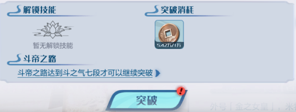 1、提供斗者基础属性加成,达到一定等级后需要突破才可继续升级,斗帝之路到达一定段位解锁突破上线。