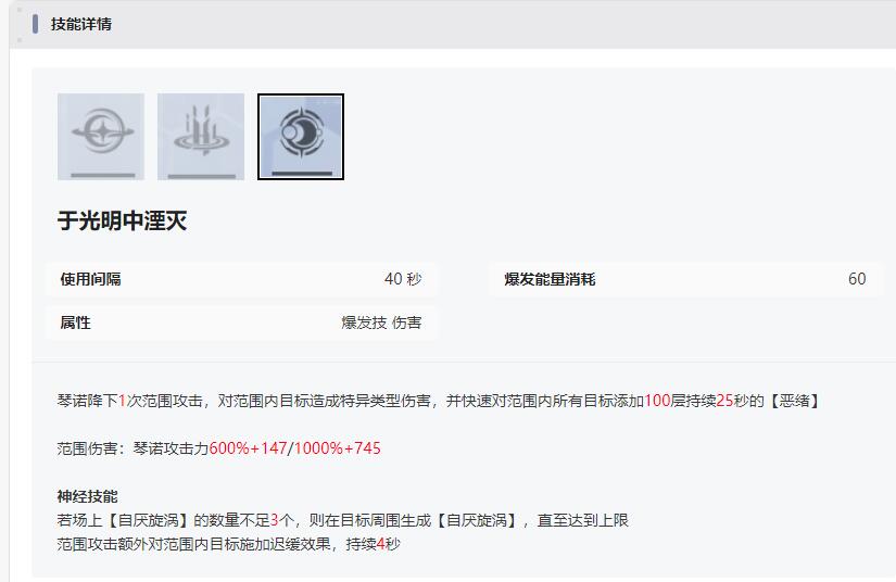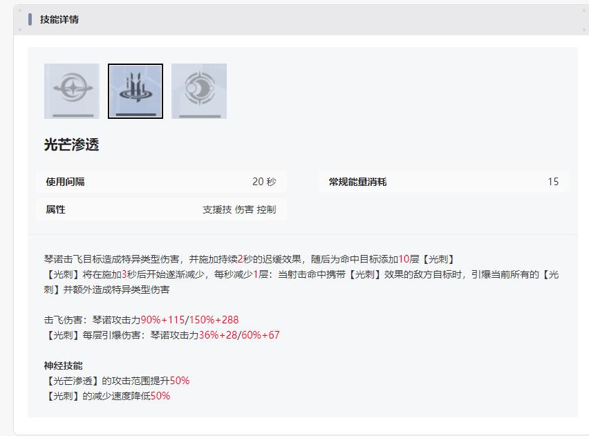 神经技能中最重要的就是跳弹也能积累恶绪层数,此效果为对冲锋枪高跳弹率的补偿,也保证了琴诺能对所有敌人进行有效的叠层。