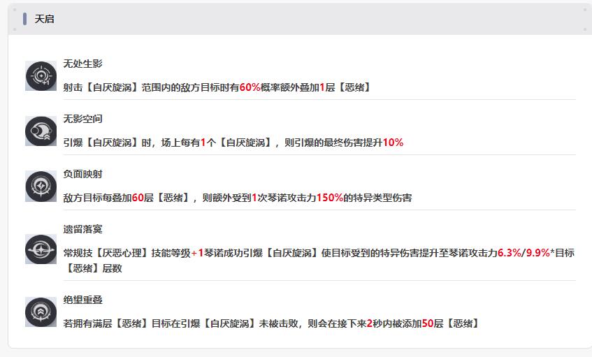 天启提升为纯粹的数值,由于定位是主C,最好是能开到2天启提升伤害。
