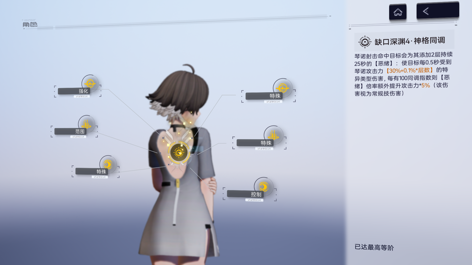 琴诺的核心机制在神格同调上,通过平射和技能堆叠层数造成持续伤害。