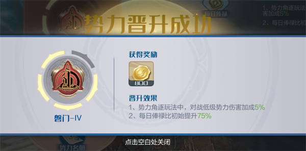达成条件可晋升势力,晋升成功后可获得晋升奖励,并获得更多的数值、属性加成或每日奖励。