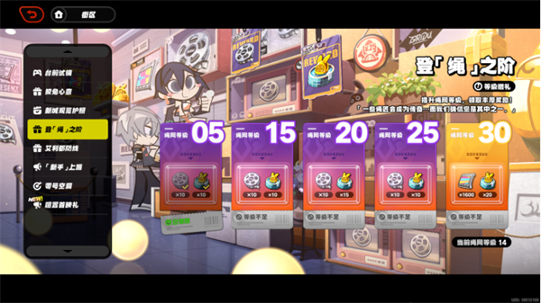 4、登绳之阶,总计领取1600菲林、40常驻、65邦布券。这个是通过提升等级获得奖励,每提升5级获得1次奖励,直到30级为止,一共可获得5次奖励。