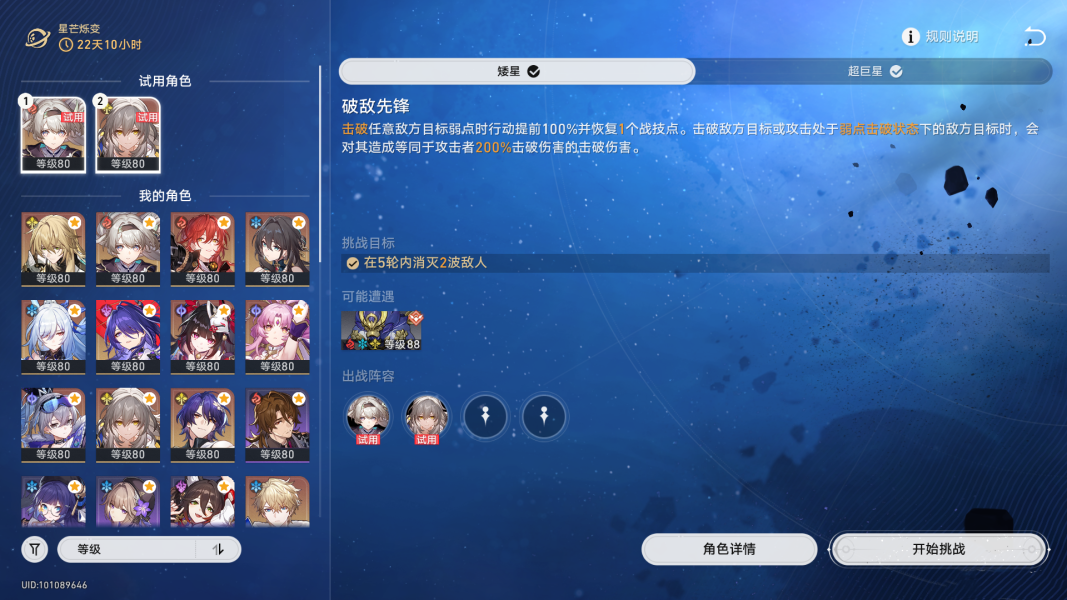 挑战目标为在5轮内消灭2波敌人,整体难度较为简单,选择试用流萤+试用开拓者挂机即可完成挑战。