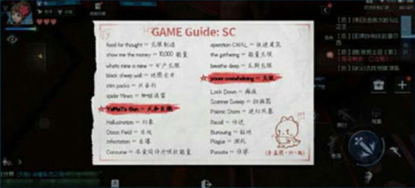 左边是写满指令的纸,标红的是这个本能用到的:无敌加一条命)和大和巨炮
