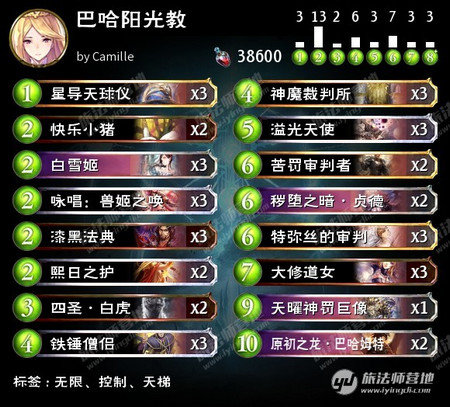 前期优先使用咏唱结界,找机会使用阳光。中后期依靠各种功能随从和阳光提供的守护控制场面,靠耗尽对手的资源或天曜神罚巨像取胜。