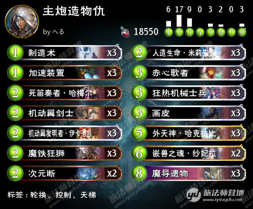 以机械降神为核心,通过大量过牌获得的手牌优势,以及变相减费获得的节奏优势,在中后期取得场面优势,进而获胜,是造物仇的主流思路。正是凭借这一强大的后期能力,造物仇在上个版本稳居T2,并隐隐有挑战T1之势。