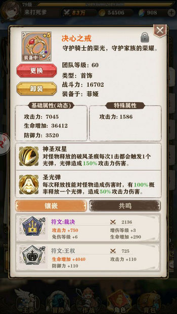 主要说潘多拉和火妈,这里有个关键,就是天行者衣服。天行衣服的属性就自身受到治疗会发出光蛋攻击敌人,这个衣服对限定伤害怪是致命的,这时候你只要给你的潘多拉和火妈配上天行衣服和吸血符文,对限定伤害怪的打击都是巨大的。还有一些专属戒指会出光蛋的那些也尽量带上,还有这里推荐上场一定要最少2个多段攻击英雄。一个基本是打不过,前排尽量保持,如果你的莉珂莉丝装备好也可以三发上阵
