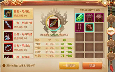 首先,提升战斗力最简单的方法就是强化和精炼!点开“熔炉”按钮,可以对武器、护腕、项链、戒指、头盔、衣服、腰带、靴子进行强化或精炼,这种方式能让你的战斗力得到飞跃!即使你更换装备强化等级也会继承。