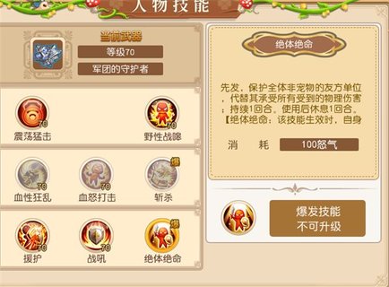 绝体绝命:先发,保护全体非宠物的友方单位,代替其承受所有受到的物理伤害,持续1回合。使用后休息1回合(绝体绝命:该技能生效时自身获得50%的伤害减免效果)