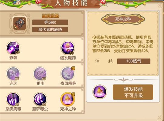 死神之种:投掷梦魇病毒药瓶,使所有敌方单位中毒3回合,中毒期间,中毒单位受到伤害增加25%,造成的伤害降低25%,受到治疗效果降低30%。使用后休息1回合。