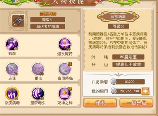恶疾病毒:利用暗器使1名敌方单位中恶疾病毒,6回合。目标中毒期间,受到的伤害增加30%;目标在中毒期间死亡,恶疾病毒将传染给1名随机敌方单位;剩余持续回合数不变;每次传染都能提升恶疾病毒的效能