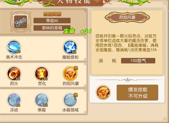 烈火: 投掷火焰,对1名敌方单位造成魔法伤害。(魔能增幅:消耗全部魔能,每消耗1点伤害增加30%)