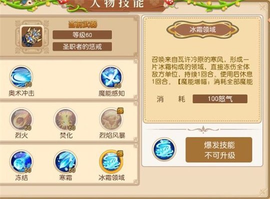 冰霜领域: 召唤来自瓦许冷原的寒风,行程一片冰霜构成的领域,直接冻伤全体敌方单位,持续1回合。使用后休息1回合(魔能增幅:消耗全部魔能,每消耗2点,冻伤的效果增加1回合)