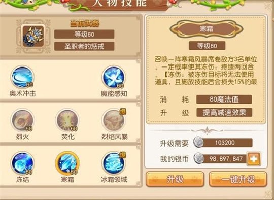 冻结: 投掷寒冰,一定概率地使1名敌方单位冻结;持续2回合(冻结:被冻结目标将无法行动;魔能增幅:最多消耗2点魔能,每消耗1点魔能增加10%命中率)