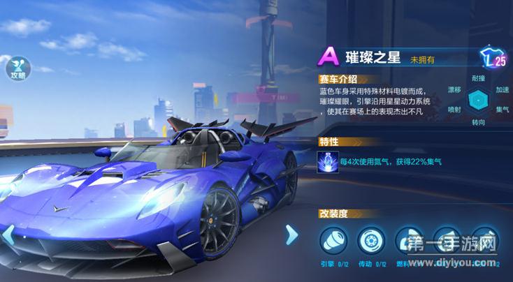 璀璨之星的引擎沿用了星星动力系统,外观也彰显了它特有的气质,璀璨之星的性能非常均衡,没有明显短板,可以很好的驾驭各种比赛地图,每4次使用氮气,获得22%集气的赛车特性也使它在赛场上有着杰出不凡的表现。