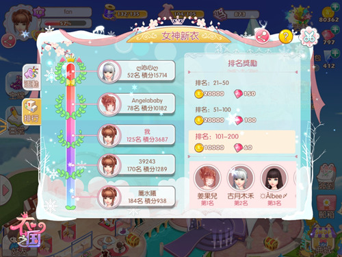 「女神的新衣」中还设定了查看好友积分的功能,你可以选择和好友同台竞技,看看谁的积分最高,当然积分越高,就可以获得更多的时装图纸、钻石、体力等奖励,如果你实力超群,成为全服前十的时尚达人之一,那么还将获得特殊奖励哟!