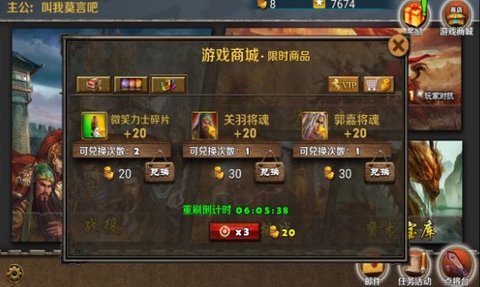金币不要乱花,两个作用一个是买神器锦囊(30金币),桃园结义礼包(30金币)的话可买可不买,一到后面几关装备就多的不行了,当然你拿来合成也行,万一成功了红装到手,除此之外限时商品也是个不错的选择。
