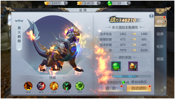 坐骑总共拥有法攻(法术攻击)、暴免(暴伤减免)、暴抗(暴击抵抗)、闪避、命中、生命、法攻总有六个属性玩友可以对单一的对某一属性进行提升,进一步的自定义培养,坐骑的培养需要培养丹,等级越高需要的培养丹也就越多。同时对坐骑进行升阶的时候也会改变坐骑的模样,每提升一阶坐骑都会不停的改变,非常的炫酷。当然坐骑也是有装备的,骑装可以对坐骑进行进一步的培养,通过装备升级整套的骑装,还可以获得更多的属性加成。