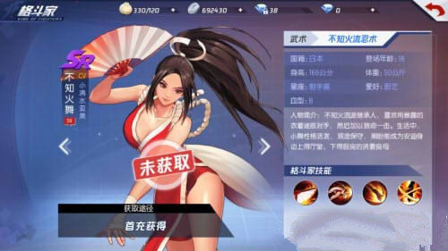 手游中充值6元后可以马上获得3星不知火舞格斗家整卡,以及部分经验泉水、技能书和升星晶体,之所以买首充主要看中的就是不知火舞,三星不知火舞已经解锁了必杀技,这个格斗家本身推图就不错,PVP会用的话也很恶心,想要继续给火舞升星的话只能是充值升VIP。