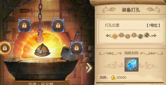 在主界面右下角阵容中,随便选择一个角色的装备,点击下面的装备强化,就可以打开铁匠铺,在第二个选项镶嵌中,选择你想要的打孔装备。点击下方有一个打孔按钮,装备打孔是需要消耗一定材料,1至20级的装备,精钢石,21至40级的装备打孔需要海蓝石,这两种打孔材料可以再商城买到。