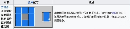 已被探索并绘制的世界部分会被复制,新探索的区域会在两个地图实例中出现。在创造模式中可以通过选择物品展示框中显示的探险家地图方块来获得复制的探险家地图(确保在选择方块时该地图不在物品栏里,否则该地图只会被移动到可用的快捷栏。