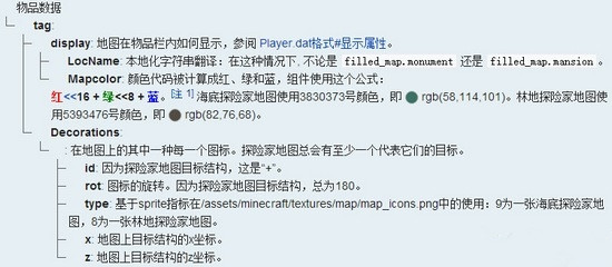 2.物品数据:探险家地图与普通地图的区别在于它的 display 标签被设置,包括一个 Mapcolor 和一个 LocName;并且它的 Decorations 列表包含一个林地府邸或海底遗迹目标的条目。它的 地图物品格式等同于一个普通地图,除了在玩友看它的时候,它的 colors 字节数组被预填充了探险家地图的特征,即地面和水的边界线和水的阴影。