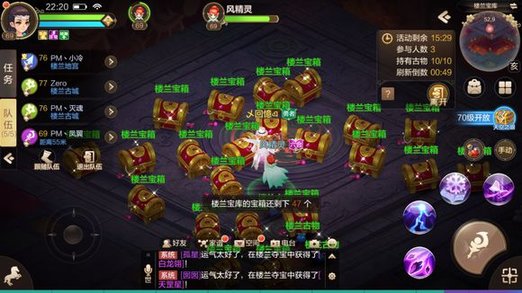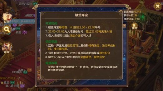 楼兰宝库,最后获得大量资源的地图。地图会随机刷新出许多楼兰古物,但是每个人只能捡取10个,楼兰古物可在积分商城兑换各种法宝物品。中间还会刷新大量楼兰宝箱,那个才是真正最后开奖的时候,各种极品法宝和物品都会在宝箱中开出同一时间段的楼兰宝箱只有100个,手快吃肉,手慢喝粥。