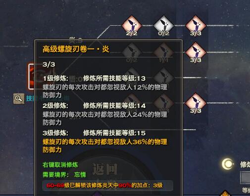 螺旋刃的伤害是持续性的,总共5S,CD10S 别看就这么小几千,但是加上技能修炼与各类BUFF叠加之后,螺旋刃的伤害会比这个数值多出N多,你只需要点出以下修炼就可完成螺旋刃的伤害升级,