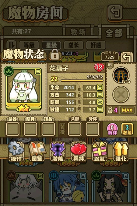 个人认为还是上暴击套或者武器换机关枪,毕竟花藕子攻速太快了,大概是其它魔物1.5倍,拿去打控制有点亏,而且羁绊有加眩晕一技能晕一两个怪完全够了。
