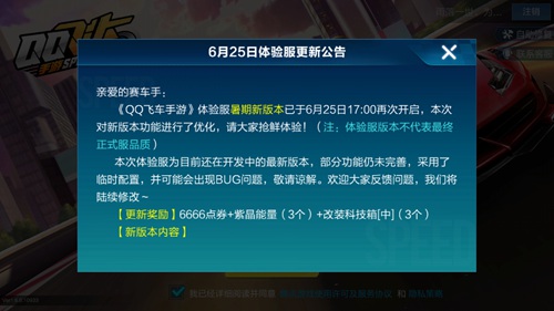 本次QQ飞车手游体验服依然开放注册资格,新玩友可以直接进入手游体验,但是维护后出现更大的BUG,大家请谨慎更新(不更新到最新版本也可以进入手游体验)。