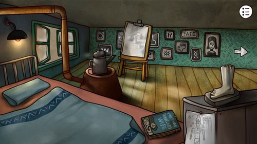 点击画板,发现画板的图像和床边桌子上订着的纸上的内容很像,机智的你觉得这一定是个后面用到的重要线索,于是你决定在屏幕右上角的笔记记下来或者给他拍张照/截个图。