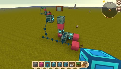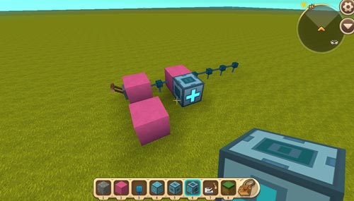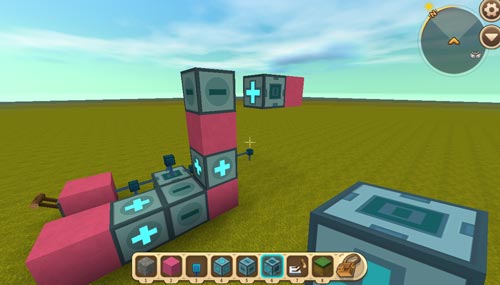 然后我们继续搭建+号方块和-号方块,当然图一滑动方块后面的辅助方块换为电能线,第二个浮空滑动方块也同样需要辅助方块来辅助调整朝向;