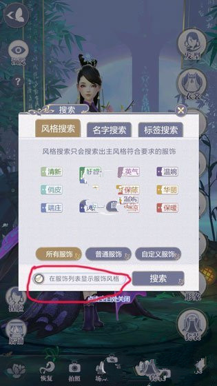 点下搜索,把所有服装,自定义服装那行按钮下面的在服装按钮显示服装风格勾上试试 在选择页面右下角选择“搜索”按钮,然后在弹出的页面下方勾选“在服饰列表显示服饰风格”,然后大家再进入 列表就可以快捷的看到当前服饰的风格定义。