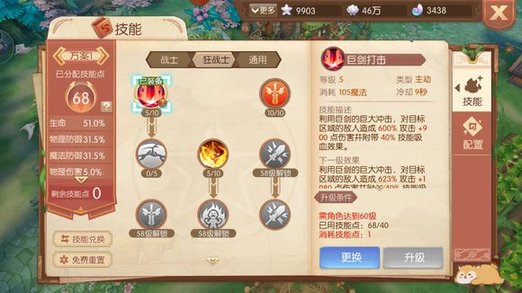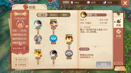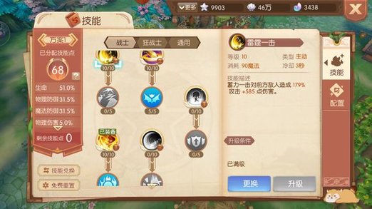 跳斩与雷霆选择其一,狂战士修炼点满,巨剑打击点满,高级怒气爆发点满。最后点通用攻击,只要加攻击的都点就对了