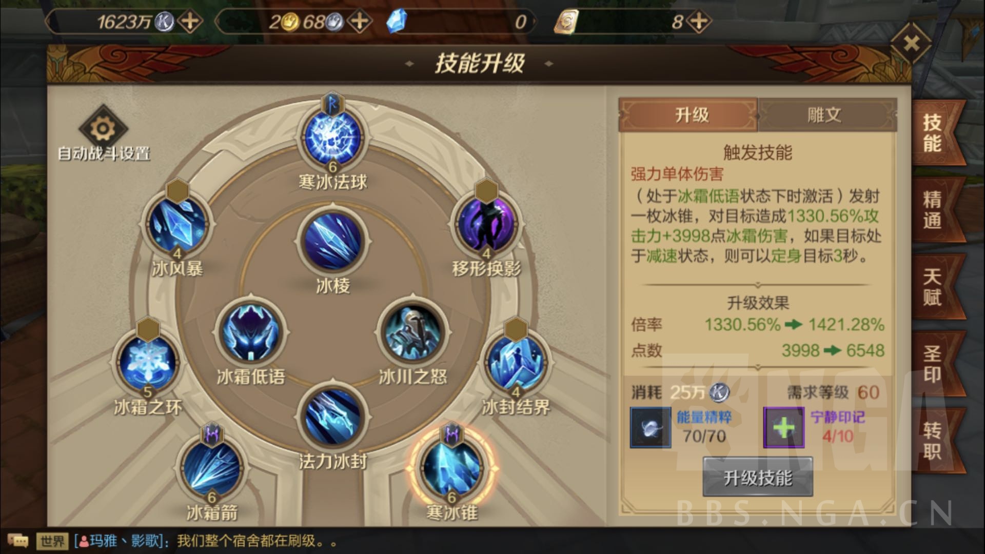 冰法精通 ,满级 4阶10,冰锥伤害加50%,触发几率加15%