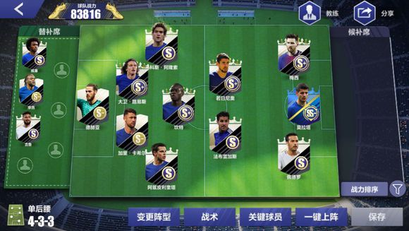 这是我昨天开始用的单后腰433,大起大落贼刺激低别人1万+战力照样赢,高别人1万战力也能输主要思路是老法若日鸟加传球点升级穿针引线走传控确保安全通过中场,到了前场交给梅西过人冷推或者佩德罗跳水再配邋遢大头进攻是还可以的。后面1个坎特省了不少事然而早上被好几个头重脚轻的低战力教育