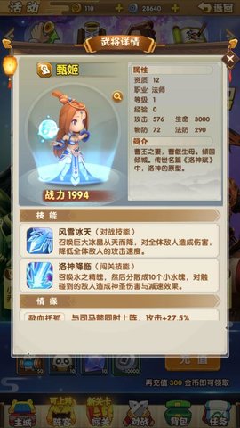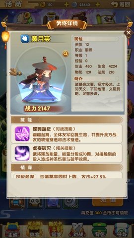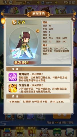 我们先来看下三位武将的技能。首先是小乔,对战技能是群奶加双穿BUFF,推图技能是神圣伤害带减魔抗。