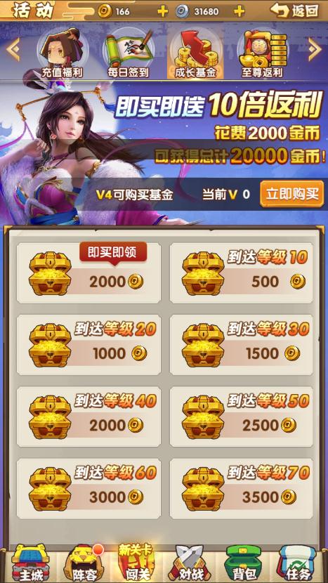 有条件的就充个V4把成长基金买了,但是金币尽量不要多花,留着等以后会开的一个财神活动。